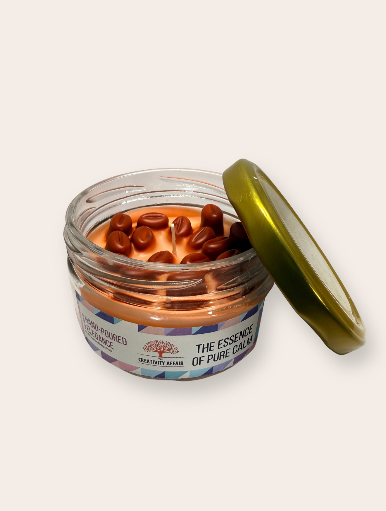 Premium coffee-scented jar candle with a golden lid, crafted to fill your space with a rich, cozy aroma.